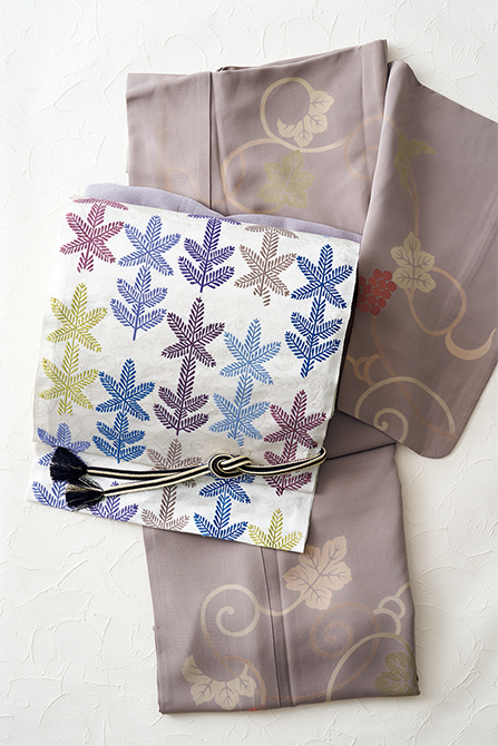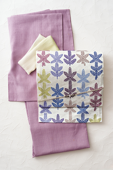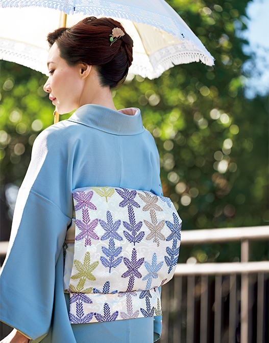 マドモアゼル・ユリアさんと、京都西陣織の老舗「川島織物セルコン」、そして『きものSalon』のコラボレーションにより誕生したオリジナルの名古屋帯「若松繫ぎ」。