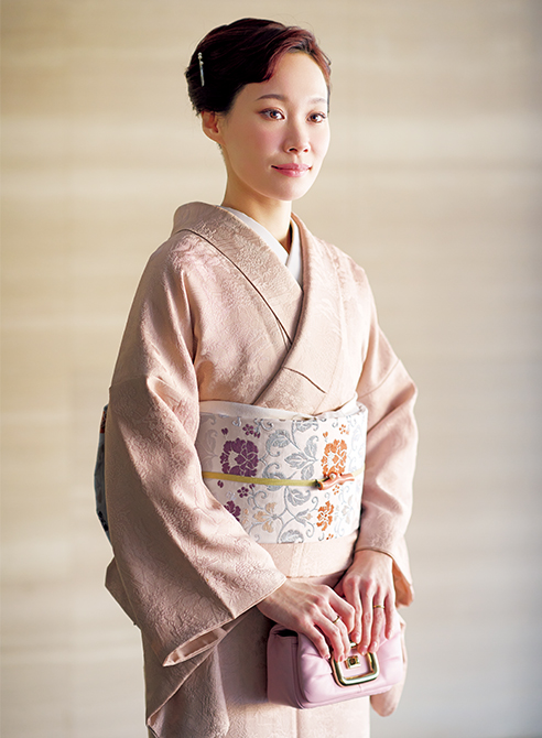 マドモアゼル・ユリアさんと、京都西陣織の老舗「川島織物セルコン」、そして『きものSalon』のコラボレーションにより誕生したオリジナルの名古屋帯「牡丹唐草段」。