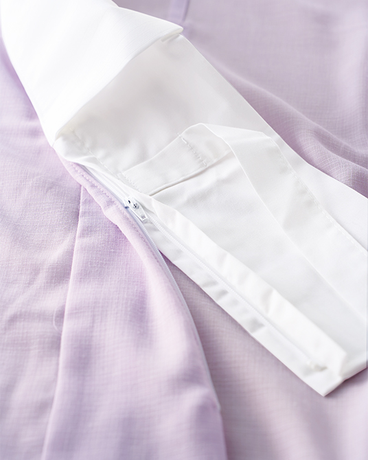 衿はファスナーで付け外しが簡単にできるので、衿だけ洗うことも可能。通年着ていただけるように、塩瀬と絽の2種類の替え衿をご用意しました。